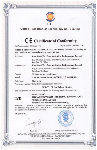 Standard:CE Numer:CTE16AR-114S Data wydania:2016-01-04 Zakres / piecyk:Industrial DC air conditioner(LVD) Wydane przez:CTE |